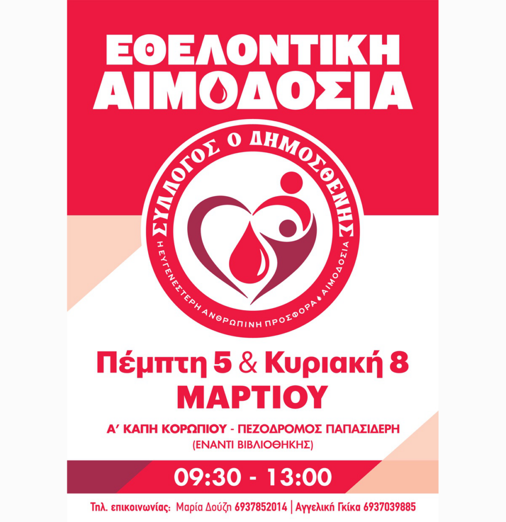Εθελοντική Αιμοδοσία στην πόλη του Κορωπίου ΚΑΠΗ πεζόδρομος Ολυμπ.ΓΣ Παπασιδέρη(Πέμπτη 5 και Κυριακή 8 Μαρτίου 2026 09:30-13:00)