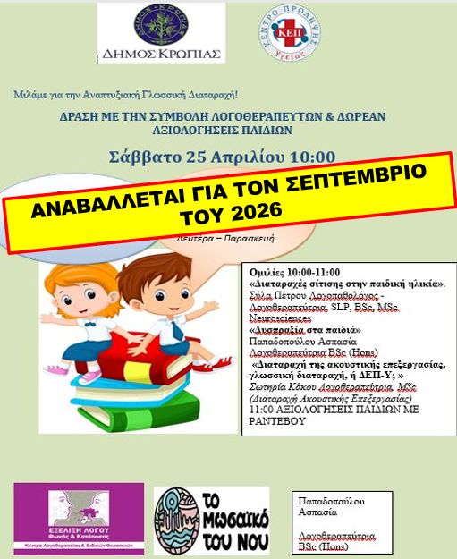 Ανακοίνωση Δήμου Κρωπίας22.04.206 : Η προγραμματισμένη ενημερωτική δράση του ΚΕΠ Υγείας Δήμου Κρωπίας με τη συμβολή λογοθεραπευτών και τις δωρεάν αξιολογήσεις παιδιών που έχει οριστεί για το Σάββατο 25 Απριλίου 2026, δεν θα πραγματοποιηθεί, αναβάλλεται για τον Σεπτέμβριο του 2026.