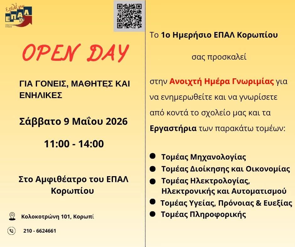 Η «Ανοιχτή Ημέρα Γνωριμίας» θα πραγματοποιηθεί το Σάββατο 9 Μαΐου 2026 στο Αμφιθέατρο του 1ου Ημερησίου ΕΠΑ.Λ Κορωπίου και ώρες 11:00’ με 14:00’. Κατά τη διάρκεια της εκδήλωσης θα πραγματοποιηθεί και ξενάγηση στους χώρους των Εργαστηρίων.