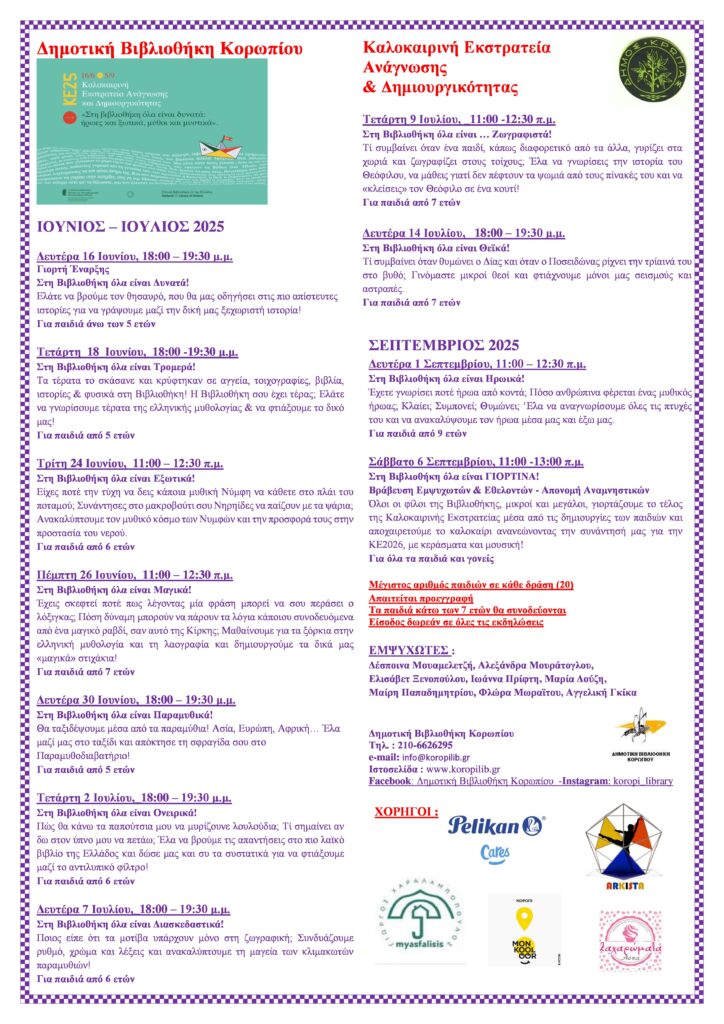 Η ΔΗΜΟΤΙΚΗ ΒΙΒΛΙΟΘΗΚΗ ΚΟΡΩΠΙΟΥ συμμετέχει και με χαρά θα υλοποιήσει (11) δημιουργικές δράσεις για παιδιά 5 έως 14 ετών (βλέπε το πρόγραμμα Δράσεις ΚΕ2025)