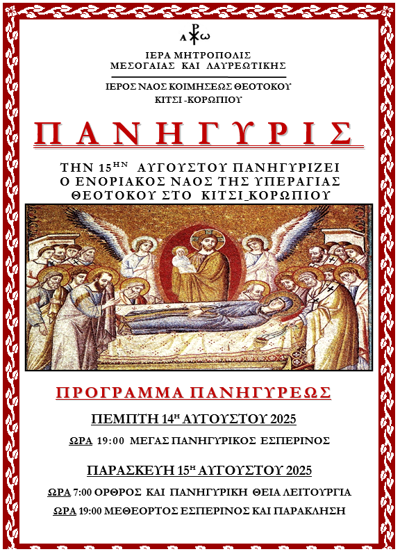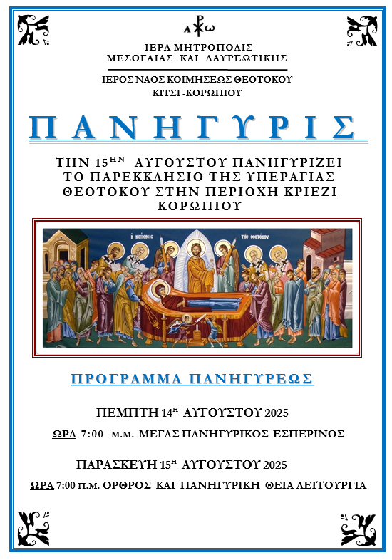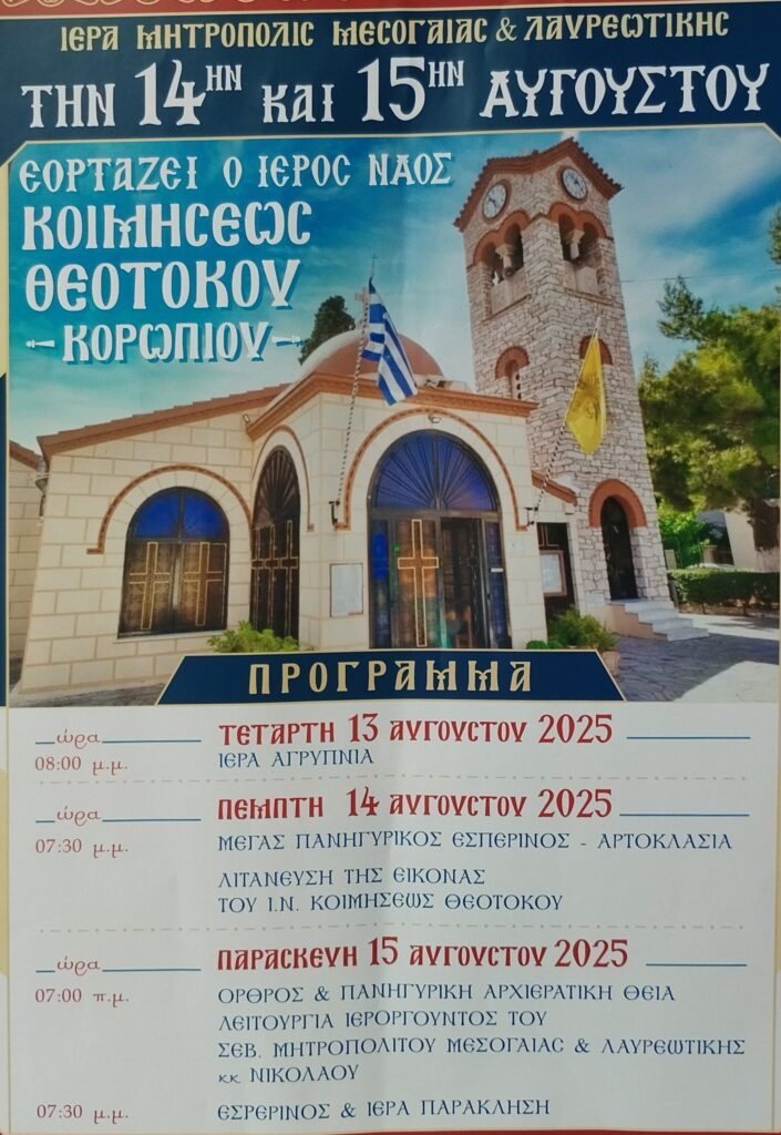 ΟΙ ΜΕΓΑΛΟΙ ΕΟΡΤΑΣΜΟΙ ΤΗΣ ΚΟΙΜΗΣΕΩΣ ΘΕΟΤΟΚΟΥ ΣΤΟ ΔΗΜΟ ΚΡΩΠΙΑΣ 2025 ΠΡΟΓΡΑΜΜΑΤΑ ΕΟΡΤΑΣΜΟΥ