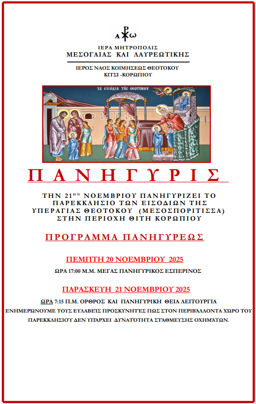 Επίσης, πανηγυρίζει την Πέμπτη 20 και Παρασκευή 21 Νοεμβρίου 2025 το Παρεκκλήσιο της Παναγίας (Μεσοσπορίτισσα) στο Θήτι – Κίτσι Κορωπίου Στις 17:00, την Πέμπτη 20 Νοεμβρίου θα τελεστεί ο Μέγας Πανηγυρικός Εσπερινός και την Παρασκευή 21 Νοεμβρίου στις 07:15, ο ΄Ορθος και η Πανηγυρική Θεία Λειτουργία.
