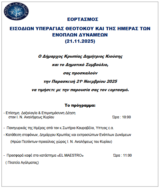 Την Παρασκευή 21 Νοεμβρίου 2025 εορτάζουμε τα Εισόδια της Υπεραγίας Θεοτόκου και την Ημέρα των Ενόπλων Δυνάμεων. Ο Δήμος Κρωπίας συμμετέχει στον καθιερωμένο διπλό Εορτασμό.Στις 10 το πρωί θα γίνει η επίσημη δοξολογία στον Ιερό Ναό Αναλήψεως του Κυρίου και θα εκφωνηθεί ο πανηγυρικός λόγος. Θα ακολουθήσει επιμνημόσυνη δέηση στο Ηρώο Πεσόντων της Πλ. Αναλήψεως και η κατάθεση στεφάνων από το Δήμαρχο Κρωπίας και τους εκπροσώπους των Ενόπλων Δυνάμεων.