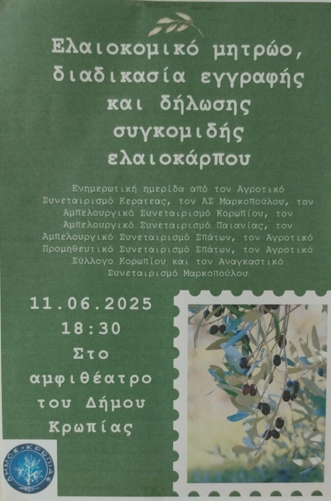 ΠΡΟΣΚΛΗΣΗ ΜΕ ΘΕΜΑ ΤΟ ΕΛΑΙΟΚΟΜΙΚΟ ΜΗΤΡΩΟ – ΔΙΑΔΙΚΑΣΙΑ ΕΓΓΡΑΦΗΣ ΚΑΙ ΔΗΛΩΣΕΙΣ ΣΥΓΚΟΜΙΔΗΣ ΕΛΑΙΟΚΑΡΠΟΥ ΤΕΤΑΡΤΗ 11 ΙΟΥΝΙΟΥ 2025, 18:30 ΔΗΜΑΡΧΕΙΟ ΚΡΩΠΙΑΣ