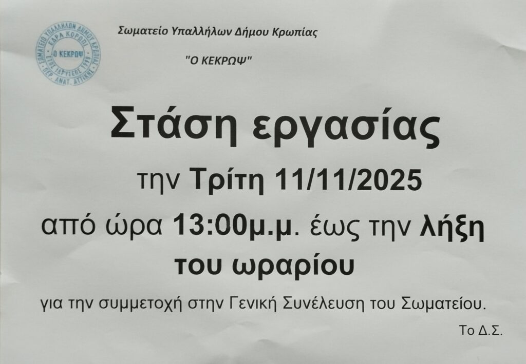 Απο το Σωματείο Εργαζομένων Δήμου Κρωπίας ανακοινώνεται στάση εργασίας την Τρίτη 11 Νοεμβρίου 2025 απο τις 13:00 έως τη λήξη ωραρίου για συμμετοχή στην Γενική Συνέλευση του Σωματείου.
